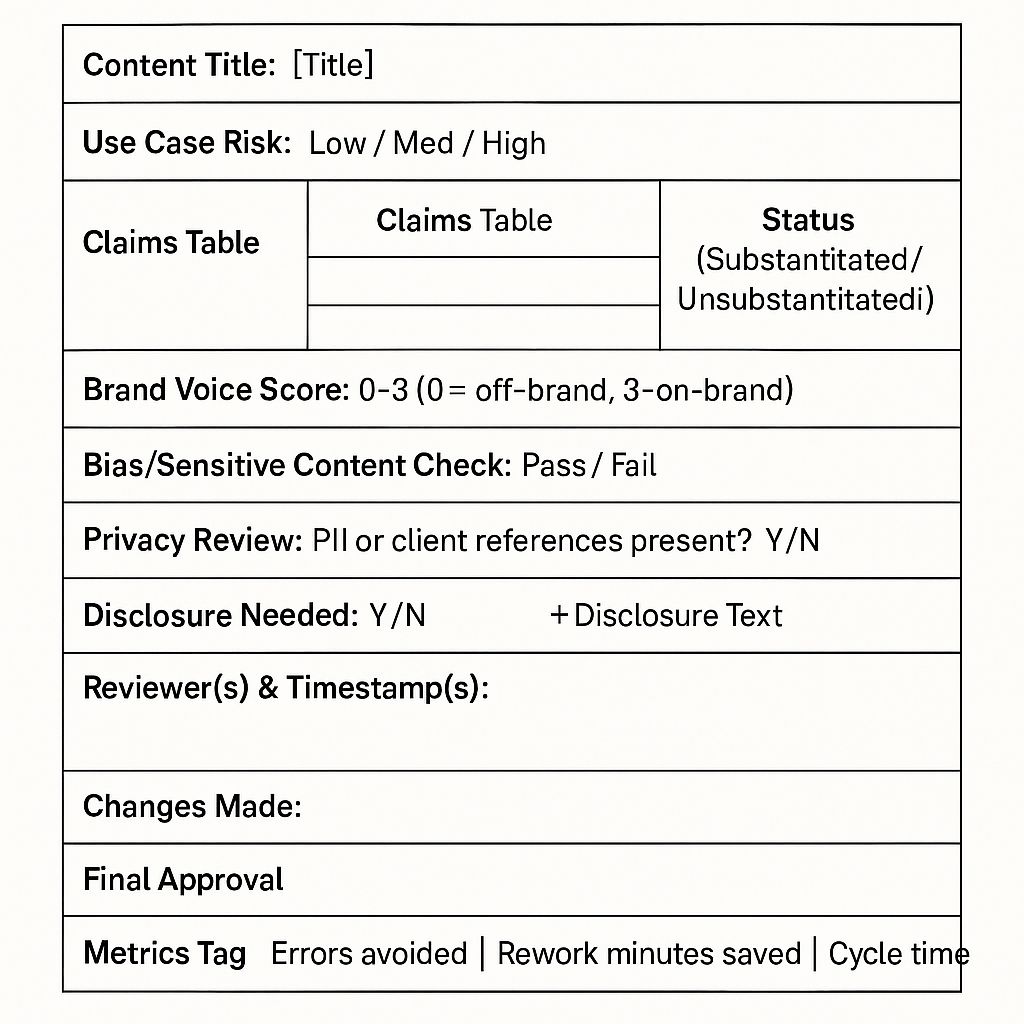 Identify your risk level based on what the content touches: regulated topics, performance claims, client names, financial data, or personally identifiable information. High-risk content needs multiple checkpoints; lower-risk work can move faster with lighter review. Define your pass/fail thresholds up front—accuracy standards, brand voice criteria, compliance red flags, and disclosure triggers. Assign clear roles using a simple RACI model so everyone knows who reviews, who approves, and who's accountable if something slips through.